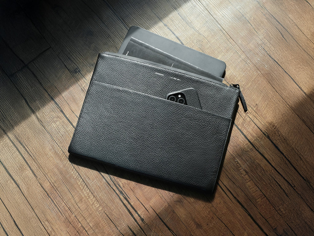 A Folio to elevate your work routine. The spacious interior has a padded sleeve for your device, along with organisational pockets for your work essentials like a charger, cables, phone and pen. Its slim and sleek build makes it the ideal case for carrying your tech on the go.