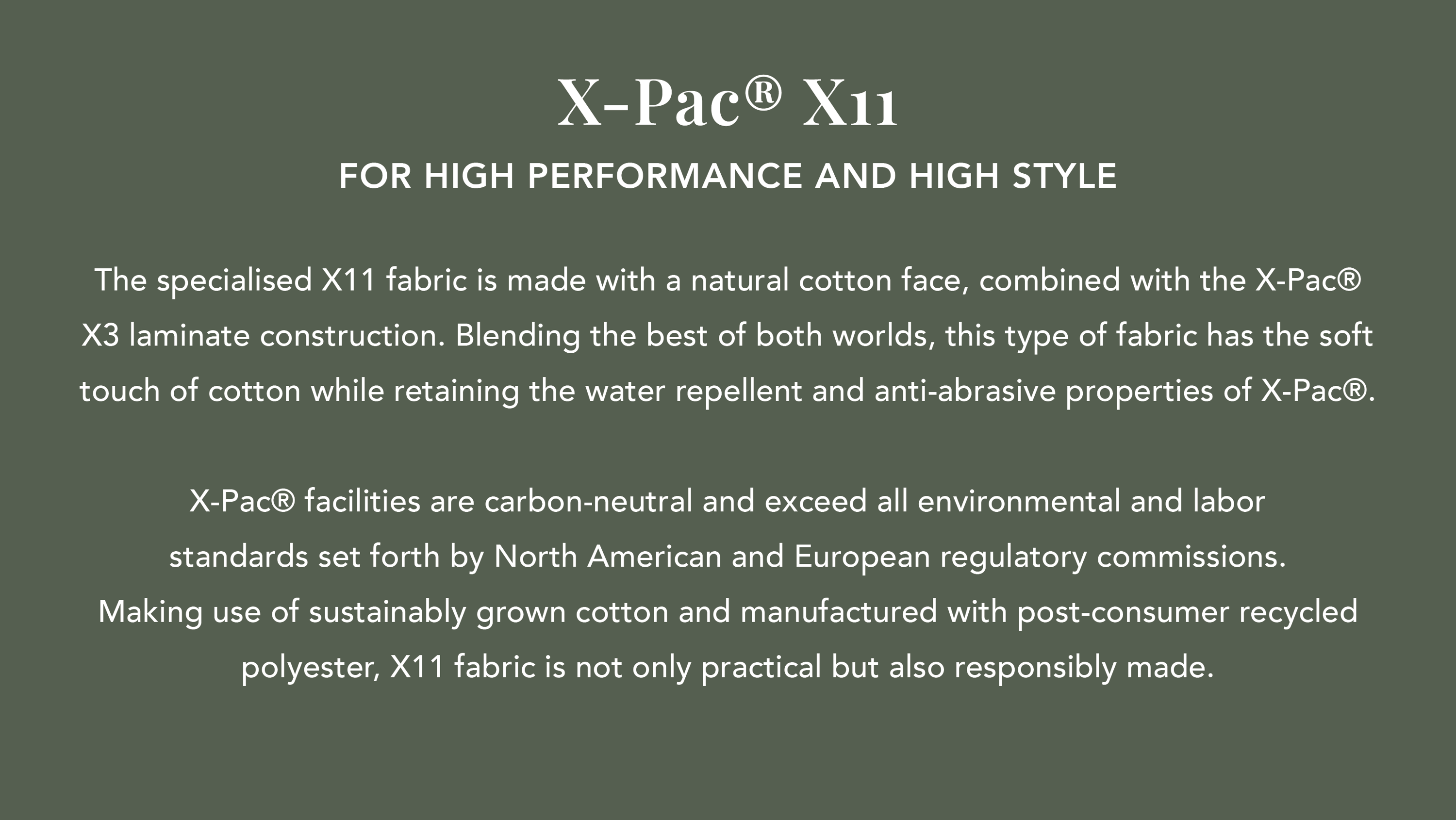 A brand of high performance laminate pack fabric inspired by sailcloth technology, made to be durable, water-resistant and light, having an impressive strength-to-weight ratio. Rugged and reliable, these fabrics are made to withstand the elements in the great outdoors. We have selected X-Pac® Fabric for its superior strength, high quality and sleek appearance.