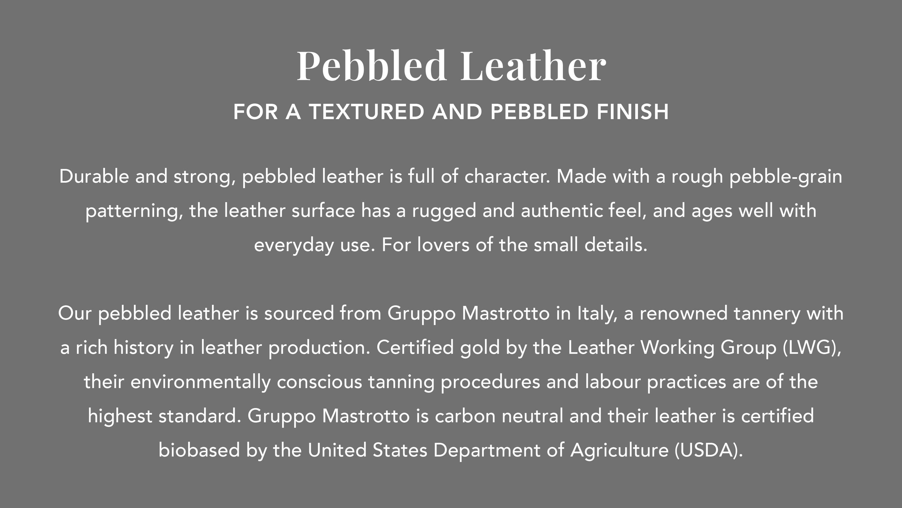 The leather we use in our products is produced from the finest grade of cowhide. The difference is in its outstanding appearance, feel, and durability. Due to full-grain and top-grain leather utilising the top layer of the hide, it has been exposed to the elements, is strong, firm and tells its own unique story.